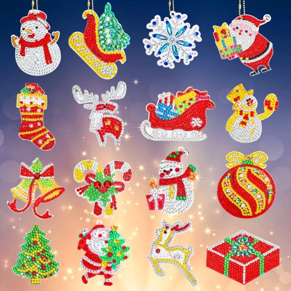 Christmas Diamond Painting Kits Item include: 16 Christmas elements plastic template 16 golden keychain Diamond making kits This Christmas decoration product will make your Christmas more wonderful for you and your children.